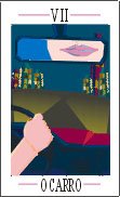 - sacrifício - paixão - desejo ardente - fé - harmonia - A carta avisa que qualquer indecisão traz mais problemas que uma má escolha, deve-se ouvir a própria voz interior. Mensagem: "Entre dois caminhos, deixe sua vontade, seu desejo, seu sentimento, seu íntimo escolher por você ". O Enamorado deve ser visto como uma carta neutra devido à sua dualidade. /////////////////////////////////////// Arcano VII - O Carro - Triunfo É a idéia de um movimento dinâmico do espírito. Indica